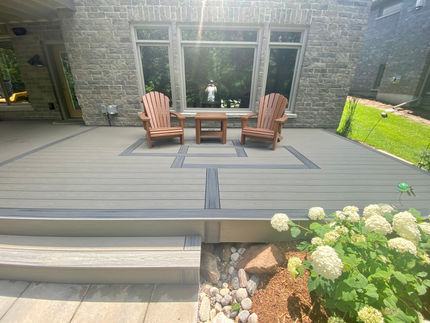 This project features Trex Transcends Island Mist & Gravel Path decking, rainescapes, aluminum glass railings, inlay designs.